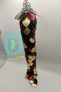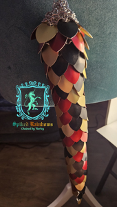 Dragon Tail made from Anodized Aluminum Scales and Bright Aluminum Rings. Measures to be 17inches in length. Has a lobster claw closure. Great for Cosplay, LARPing or Ren Faires. Will ship within 3 business days of order.