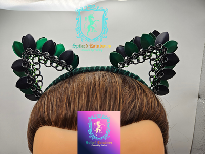 Velvet wrapped wire headband with Anodized Aluminum Scales and Rings. Great for Cosplay, Ren Faires, etc. Super cute and comfortable to wear. Will ship within 3 business days.