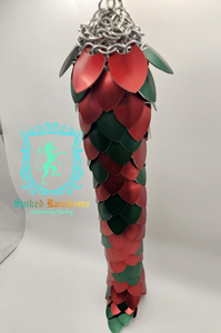Dragon Tail made from Anodized Aluminum Scales and Bright Aluminum Rings. Measures to be 17inches in length. Has a lobster claw closure and bells hidden inside. Great for Cosplay, LARPing or Ren Faires. Will ship within 3 business days of order.